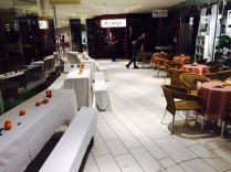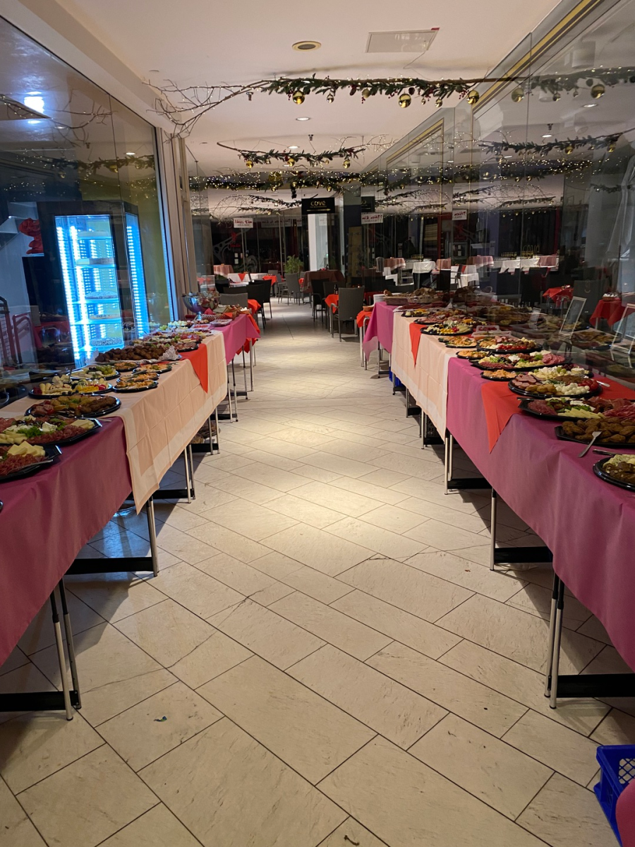 Sie können ihre Getränkegutscheine für Sekt einlösen, aber für jedes andere Getränk auch. Wie Sie wünschen. Es wird Antipasti, Käse, Fisch, Wurst, Schinken, Buletten, und Mettendchen gereicht. Es gibt das Hausbrot von Tollkötter, Brezeln und Baguette. Berliner zum Dessert.
